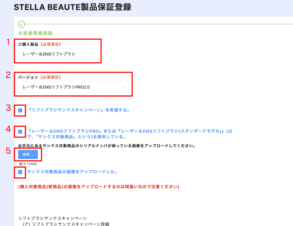 購入商品選択・キャンペーン希望欄へチェックを入れ、シリアルナンバーの画像をアップロードする。